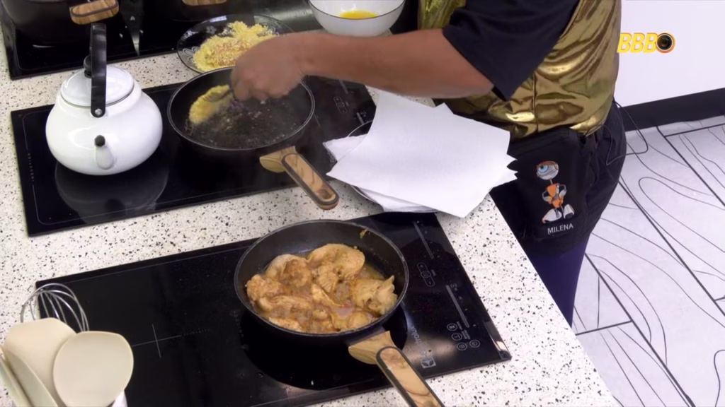 Enquanto o caos reinava nas relações interpessoais, a convivência básica também atingiu níveis deploráveis na cozinha da Xepa. Milena, que está cumprindo o duríssimo castigo do Monstro ao lado de Ana Paula, preparou com muito custo filés de peito de frango empanados e guardou uma porção no forno para a líder. A atitude foi um gesto de solidariedade para com Ana Paula, que estava sem comer desde o almoço do patrocinador.